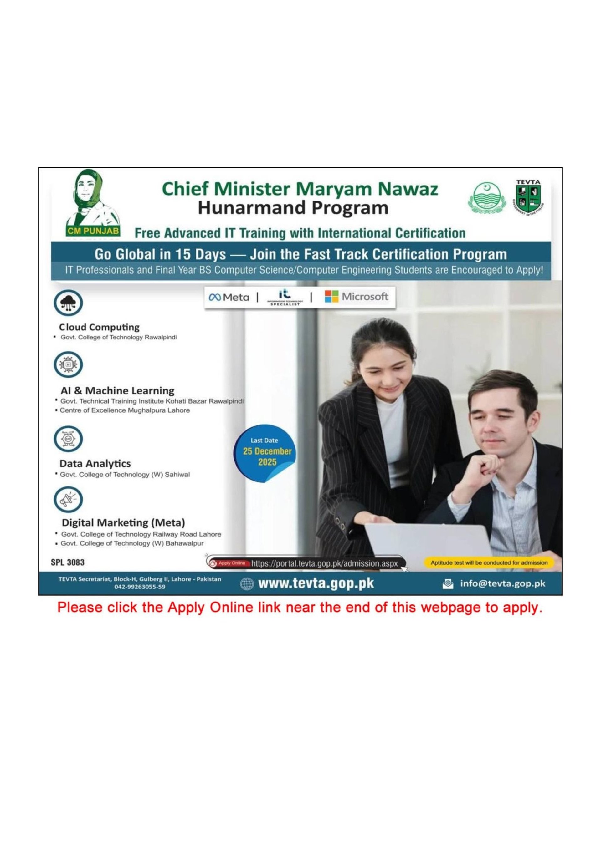 CM Punjab Hunarmand Program December 2025 TEVTA Free IT Training with International Certification