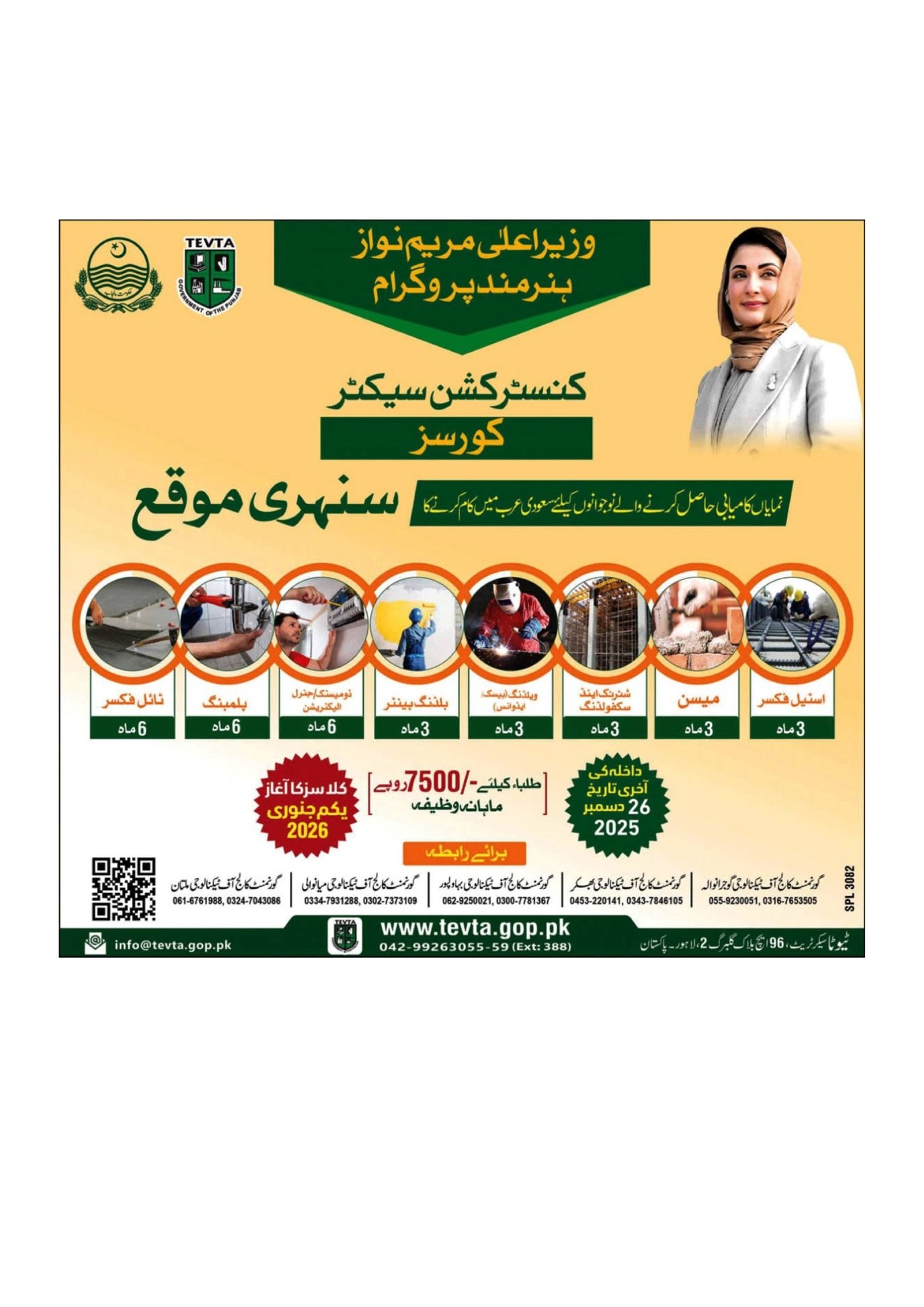 TEVTA Free Courses December 2025 CM Punjab Hunarmand Program Construction Sector