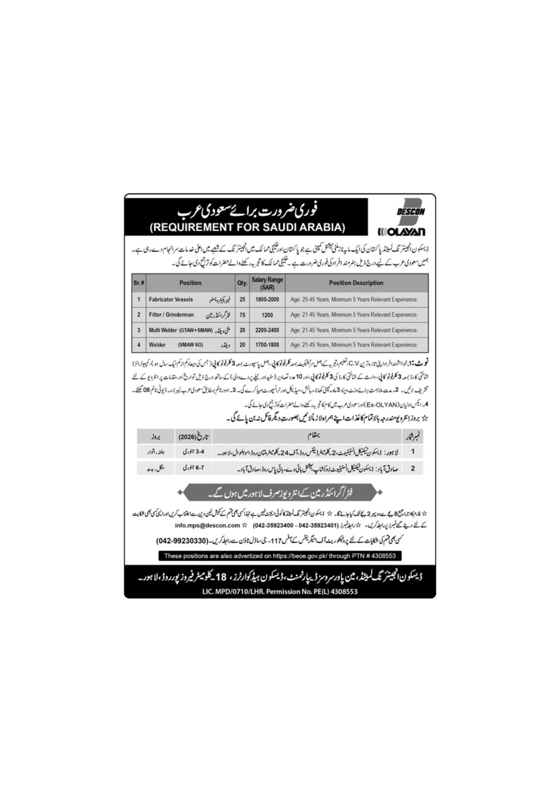 DESCON Engineering Saudi Arabia Jobs Fitters, Riggers, Welders & Others Olayan Latest سعودی عرب