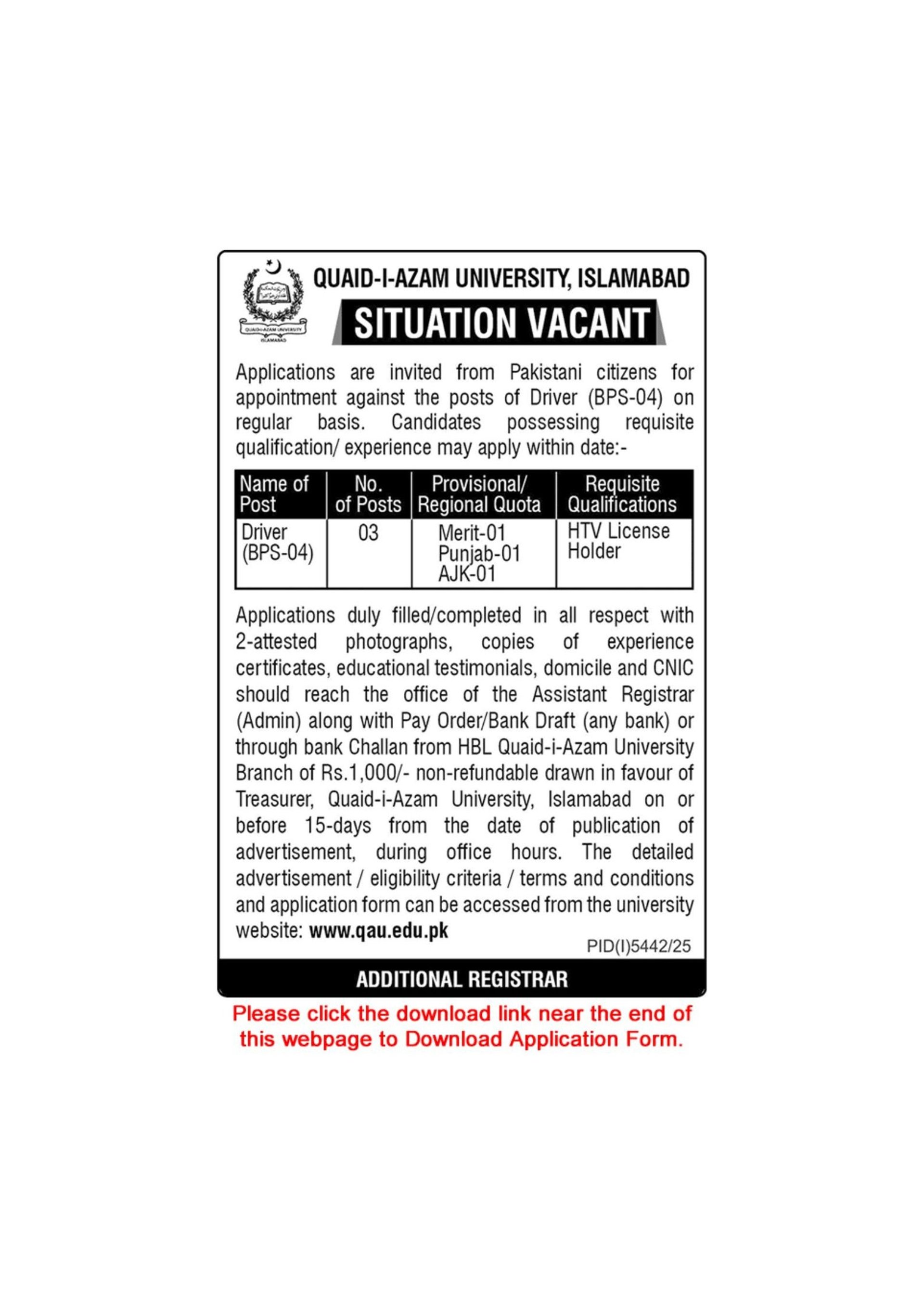 Driver Jobs in Quaid-i-Azam University Islamabad 2026 Application Form QAU