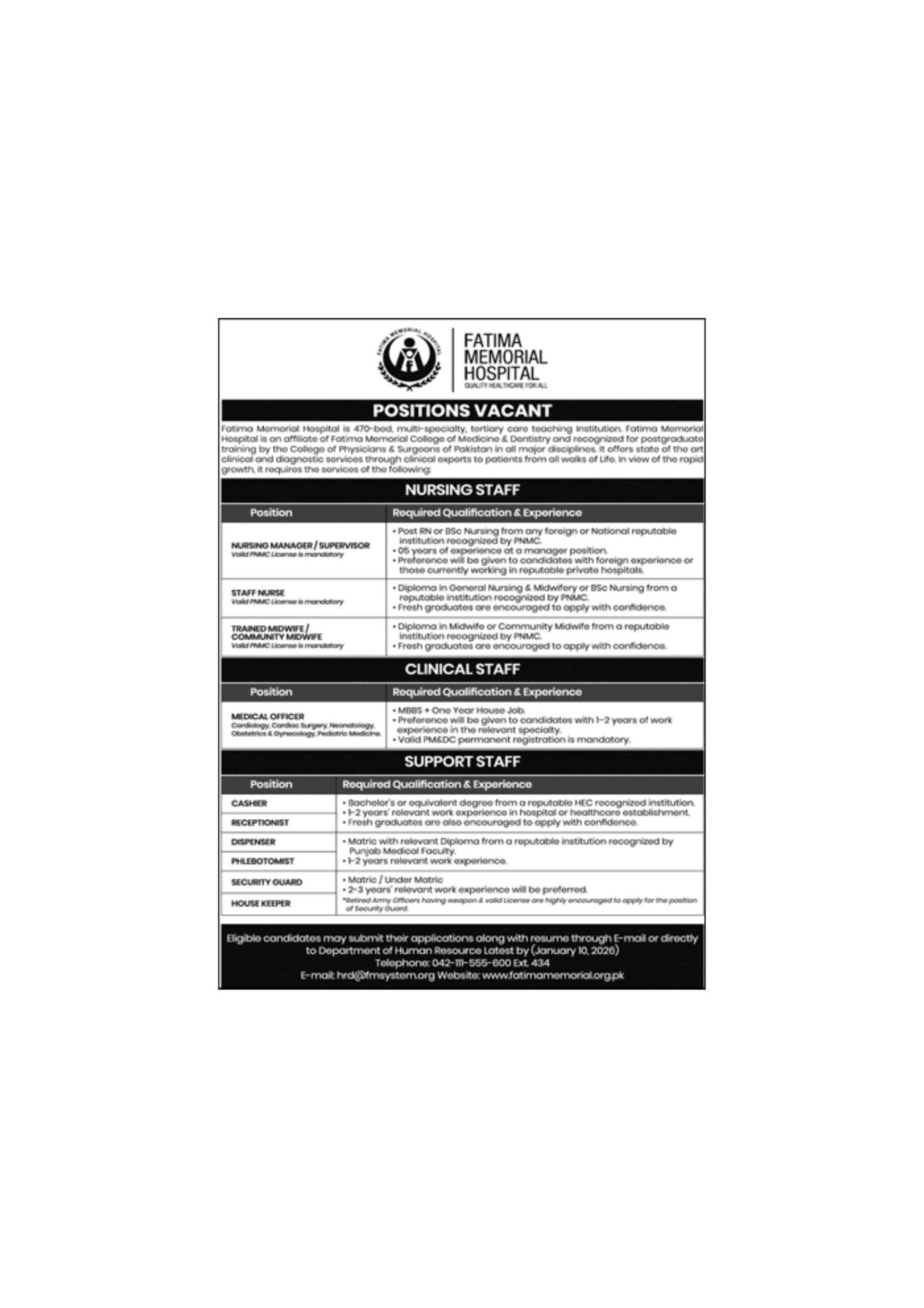 Fatima Memorial Hospital Lahore Jobs December 2025 / 2026 Medical Officers, Nurses & Others