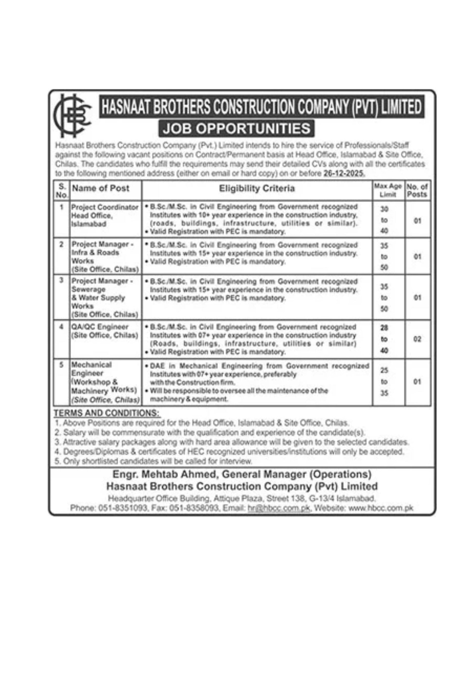 Hasnaat Brothers Construction Company Islamabad Jobs 2025 December Project Managers & Others