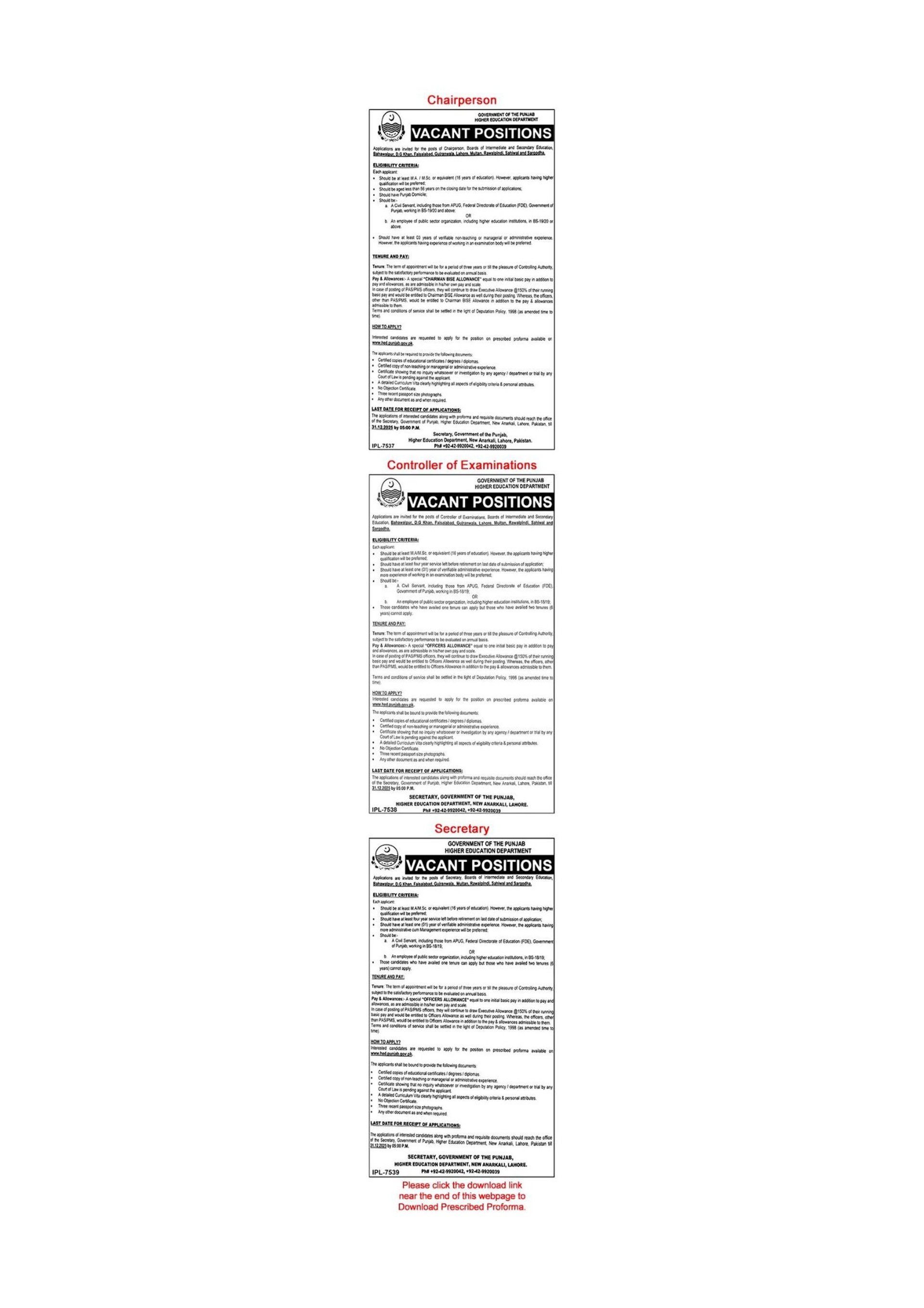 Higher Education Department Punjab Jobs December 2025 Application Form Chairman, Controller of Examinations & Secretary Latest