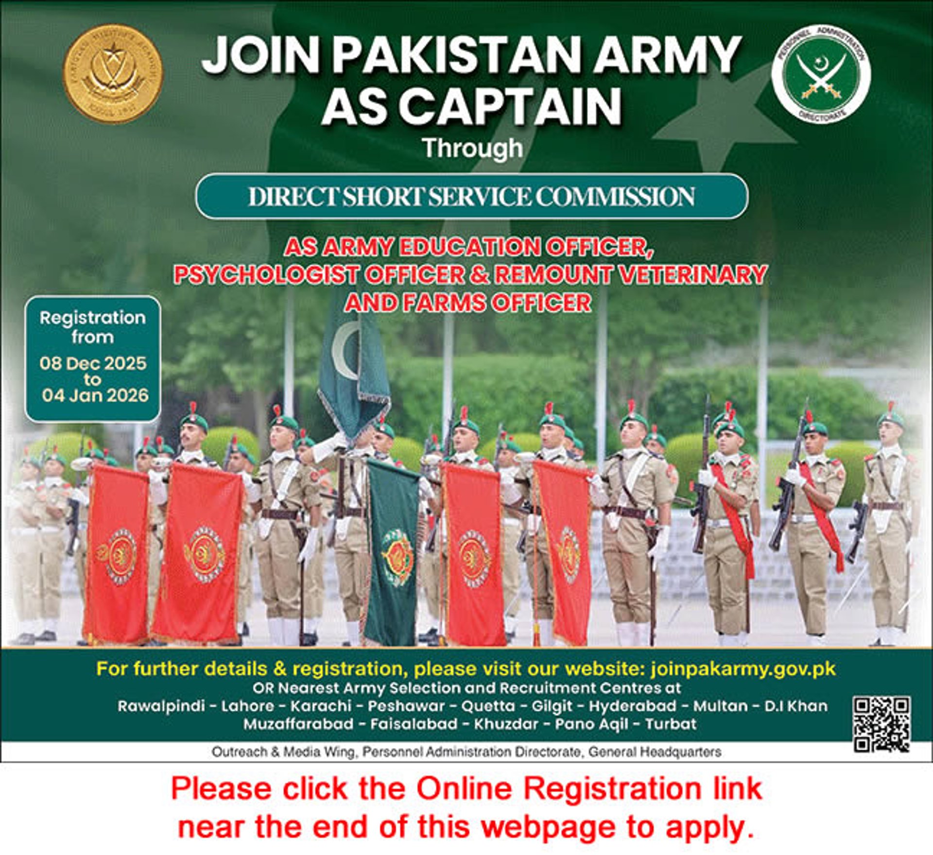 Join Pakistan Army as Captain December 2025 through Direct Short Service Commission Online Registration Latest