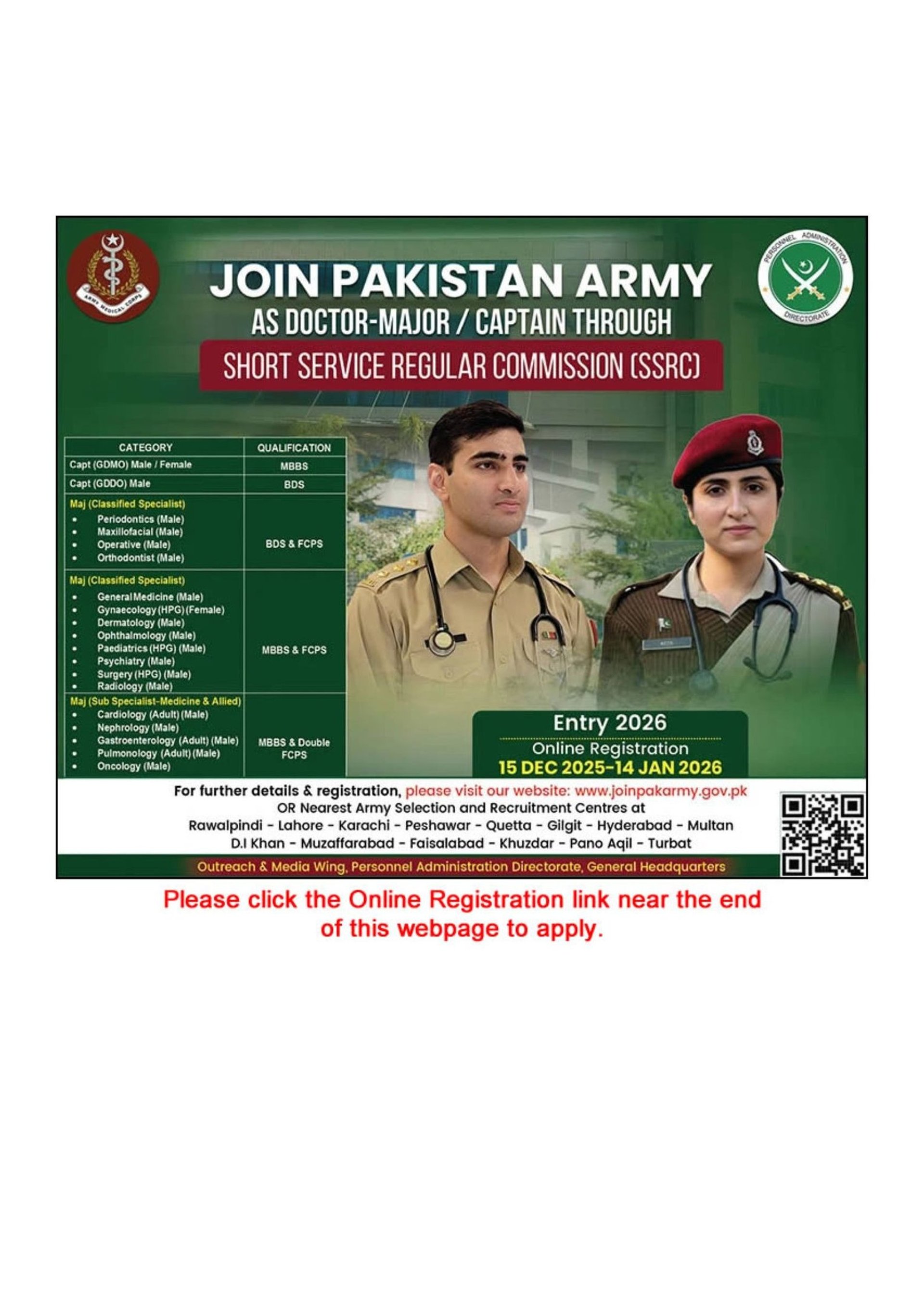 Join Pakistan Army as GDMO & Specialist December 2025 / 2026 Online Registration through Short Service Regular Commission Latest