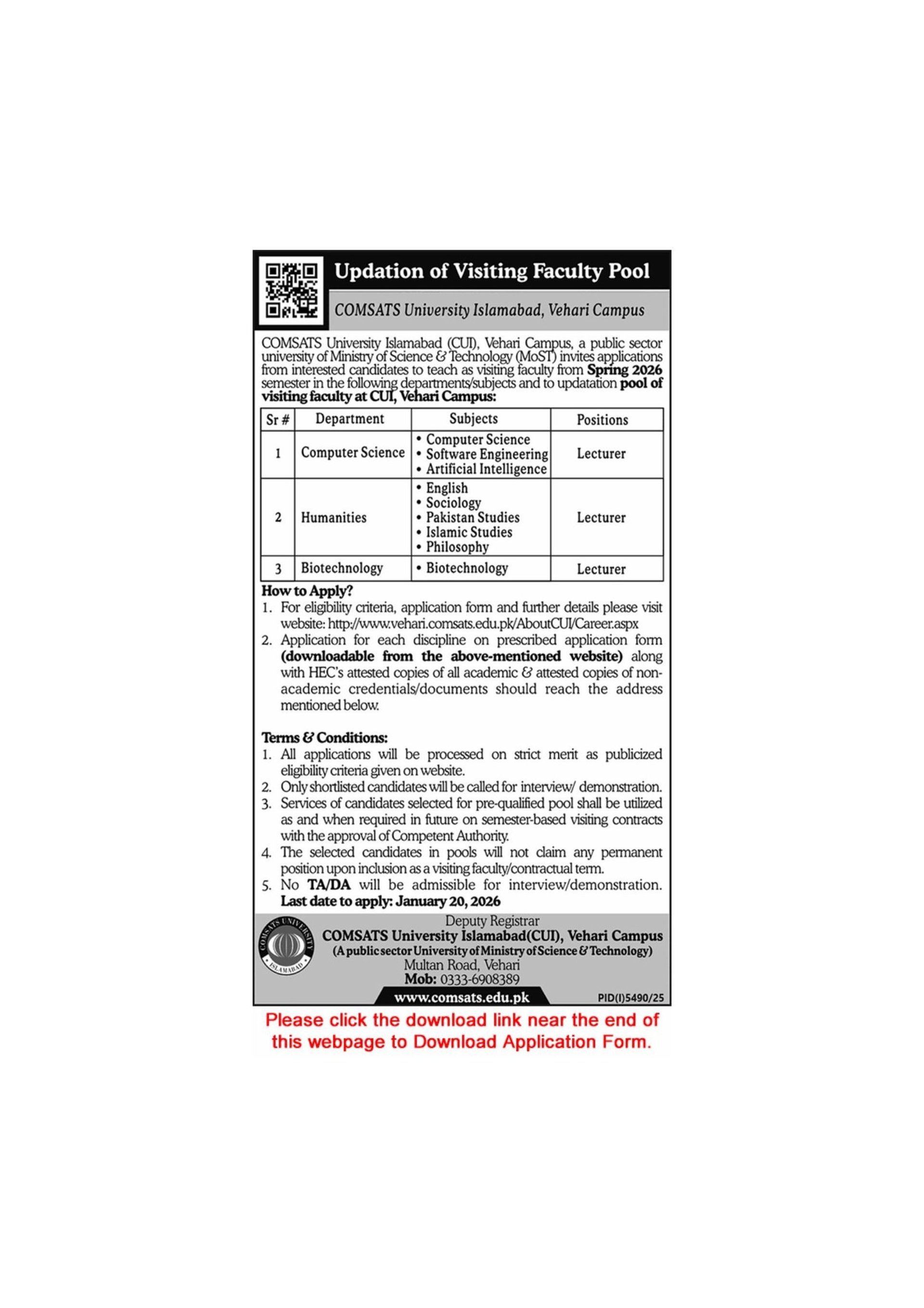www.vehari.comsats.edu.pk/About/CUI/career Application Form Download Online