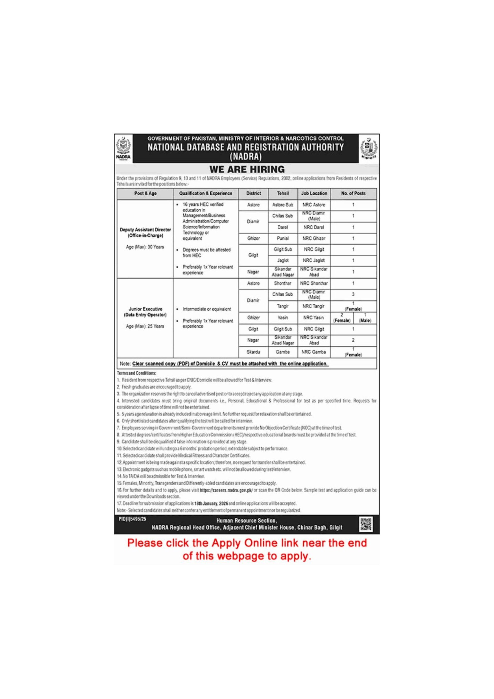 NADRA Gilgit Baltistan Jobs 2026 Apply Online Junior Executives & Deputy Assistant Directors