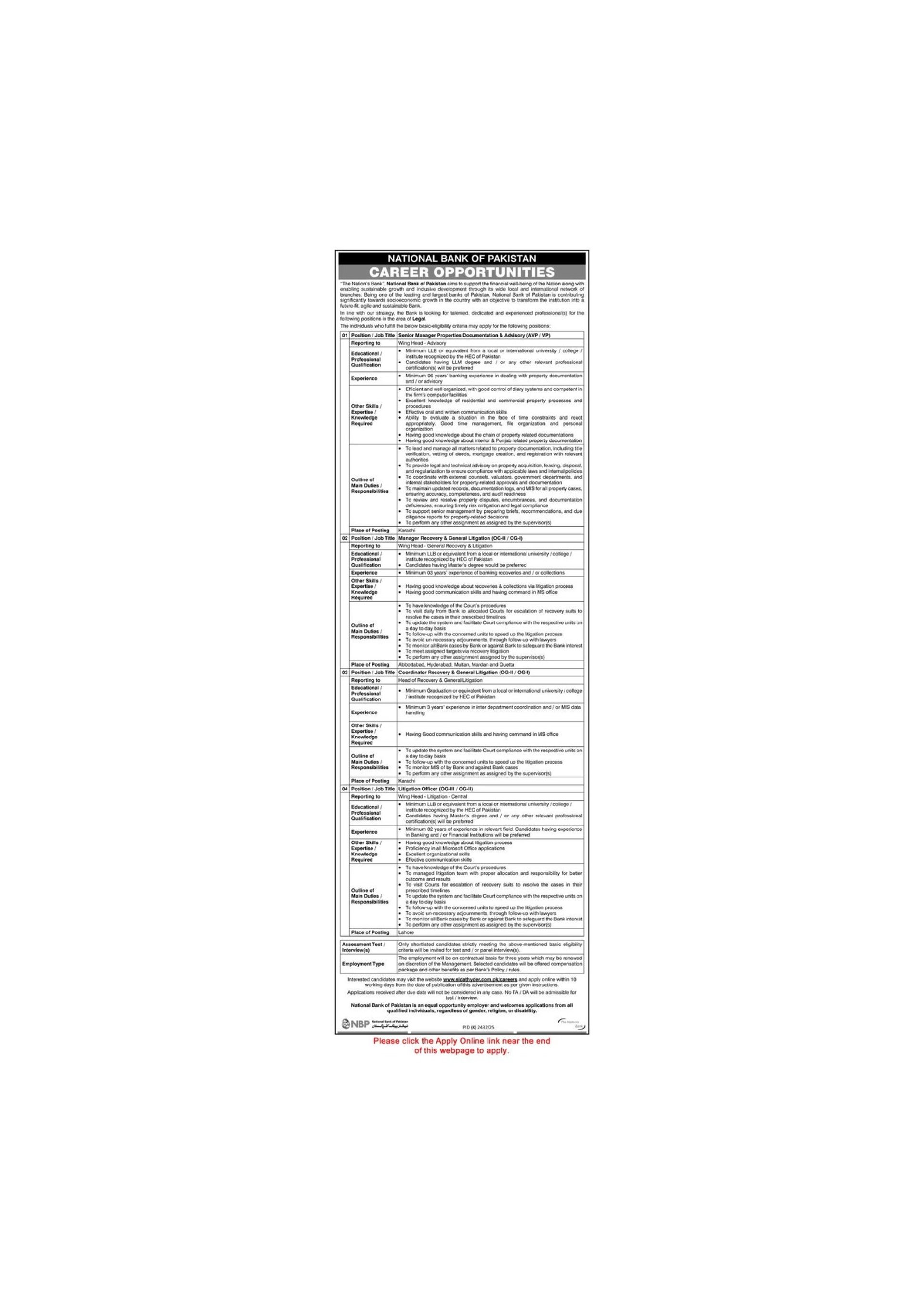 National Bank of Pakistan Jobs 2026 Apply Online Recovery / Litigation Manager & Others NBP Latest