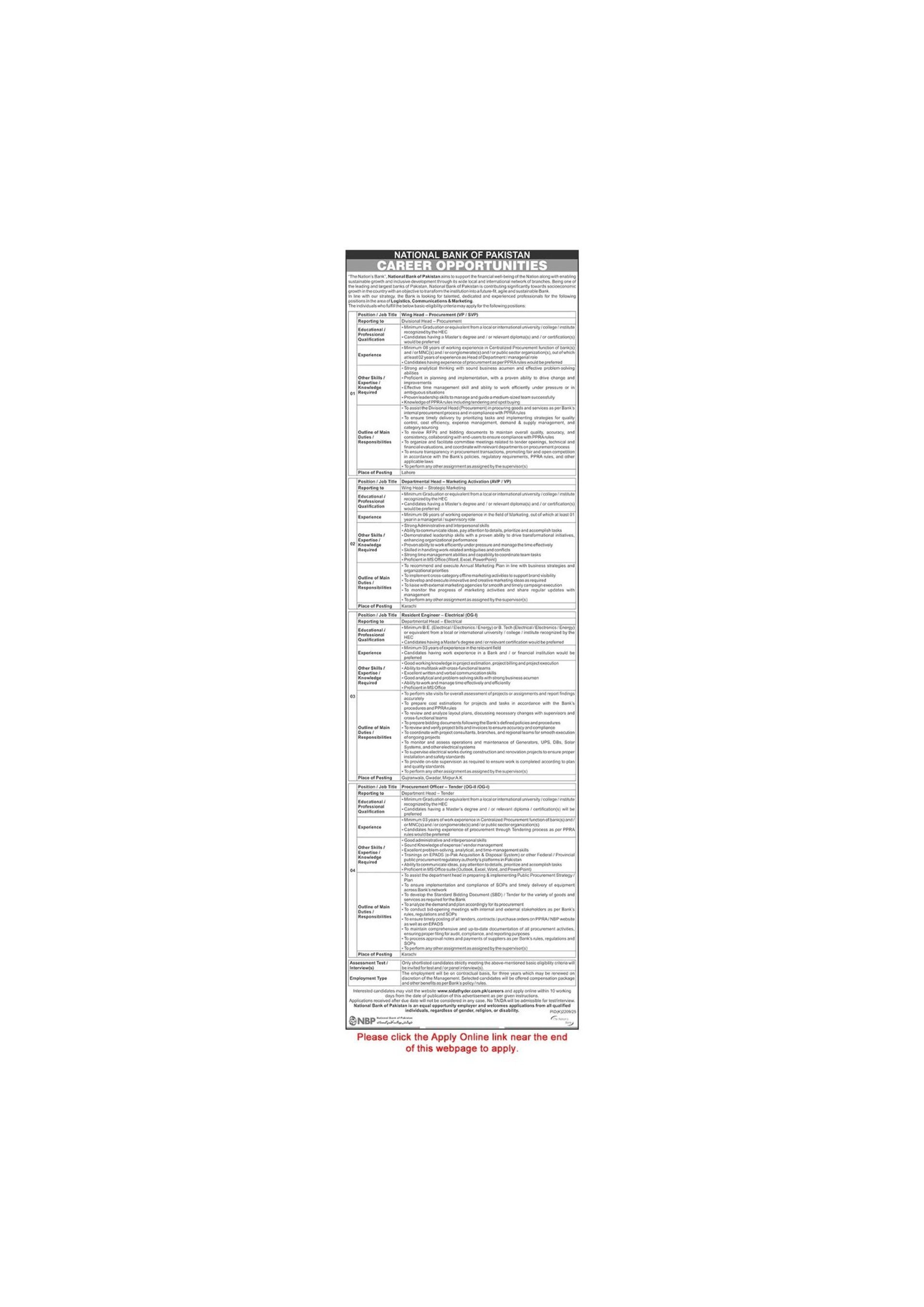 National Bank of Pakistan Jobs December 2025 / 2026 Apply Online Electrical Engineers & Others NBP