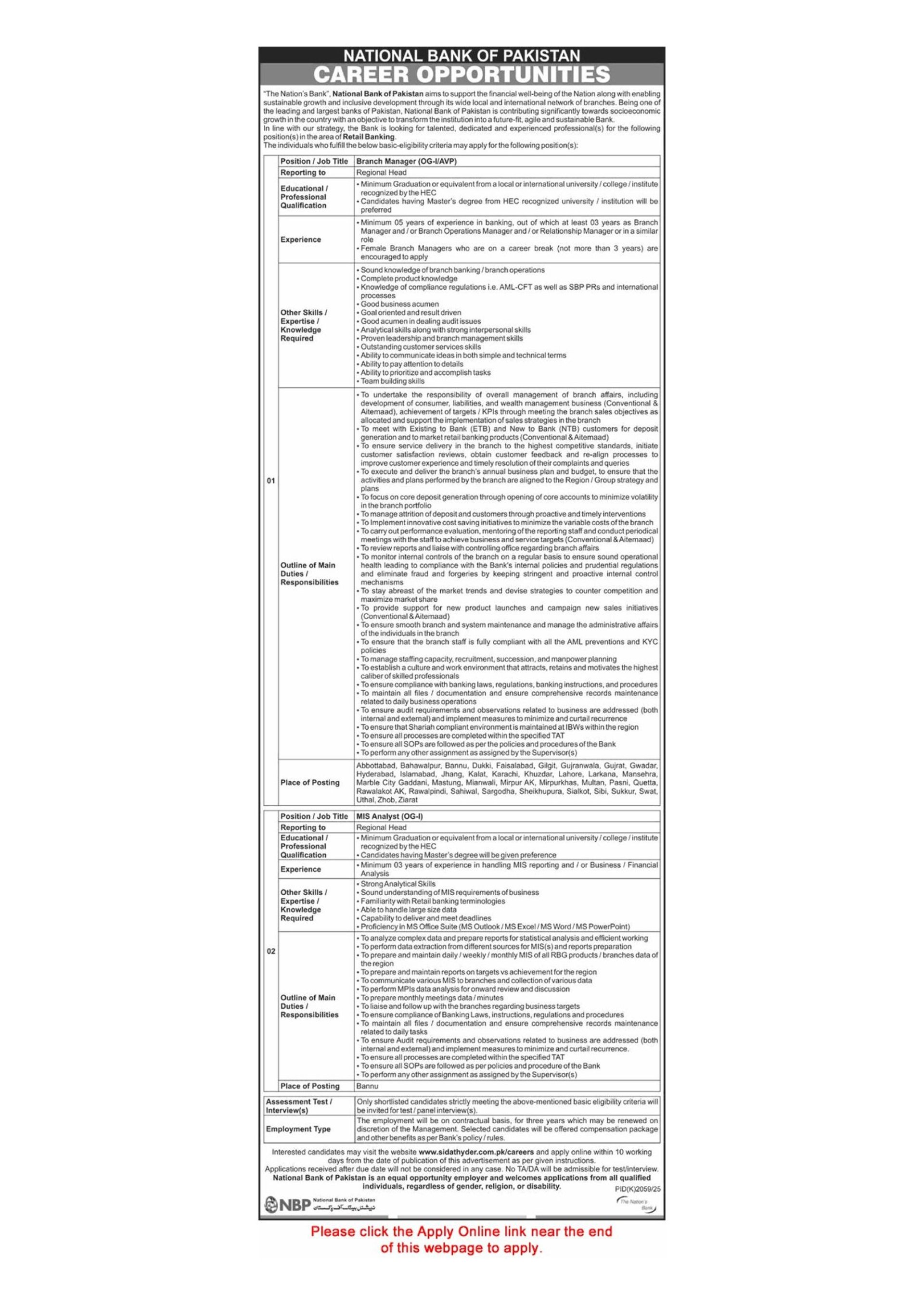 National Bank of Pakistan Jobs December 2025 Apply Online Branch Managers & MIS Analysts NBP