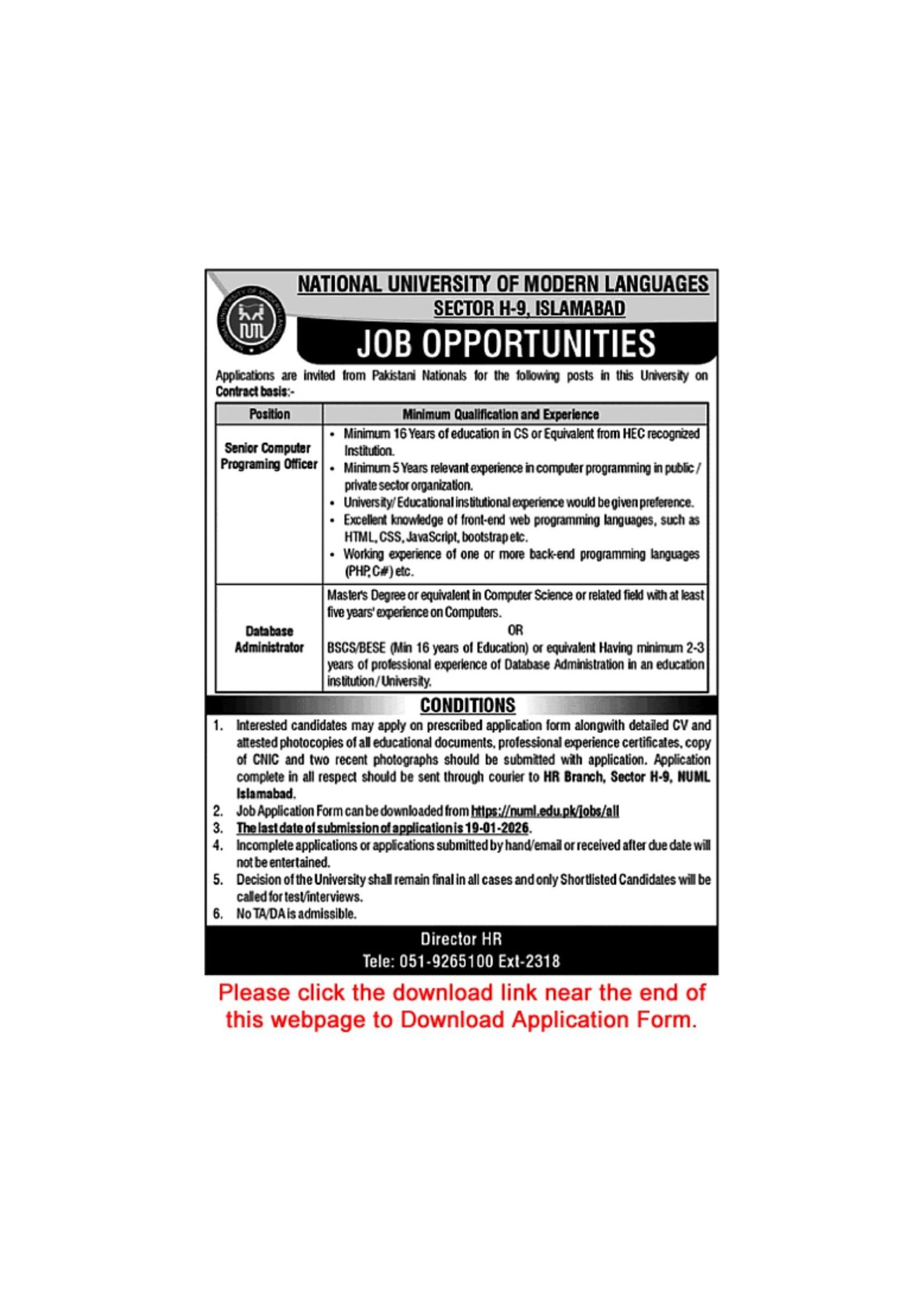 NUML University Islamabad Jobs 2026 Application Form Computer Programming Officer & Database Administrator Latest