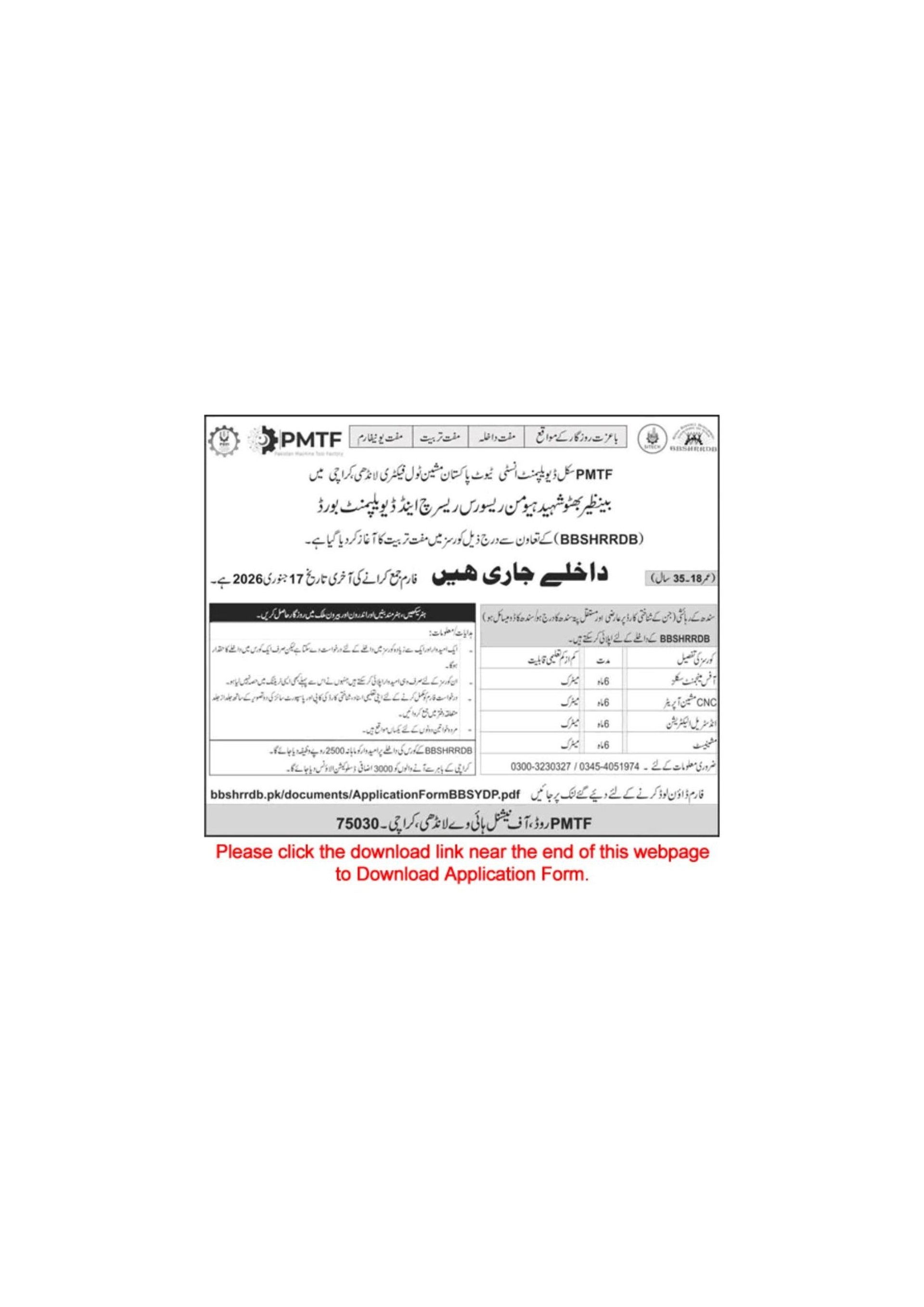Pakistan Machine Tool Factory Karachi Free Courses 2026 Application Form PMTF BBSHRRDB