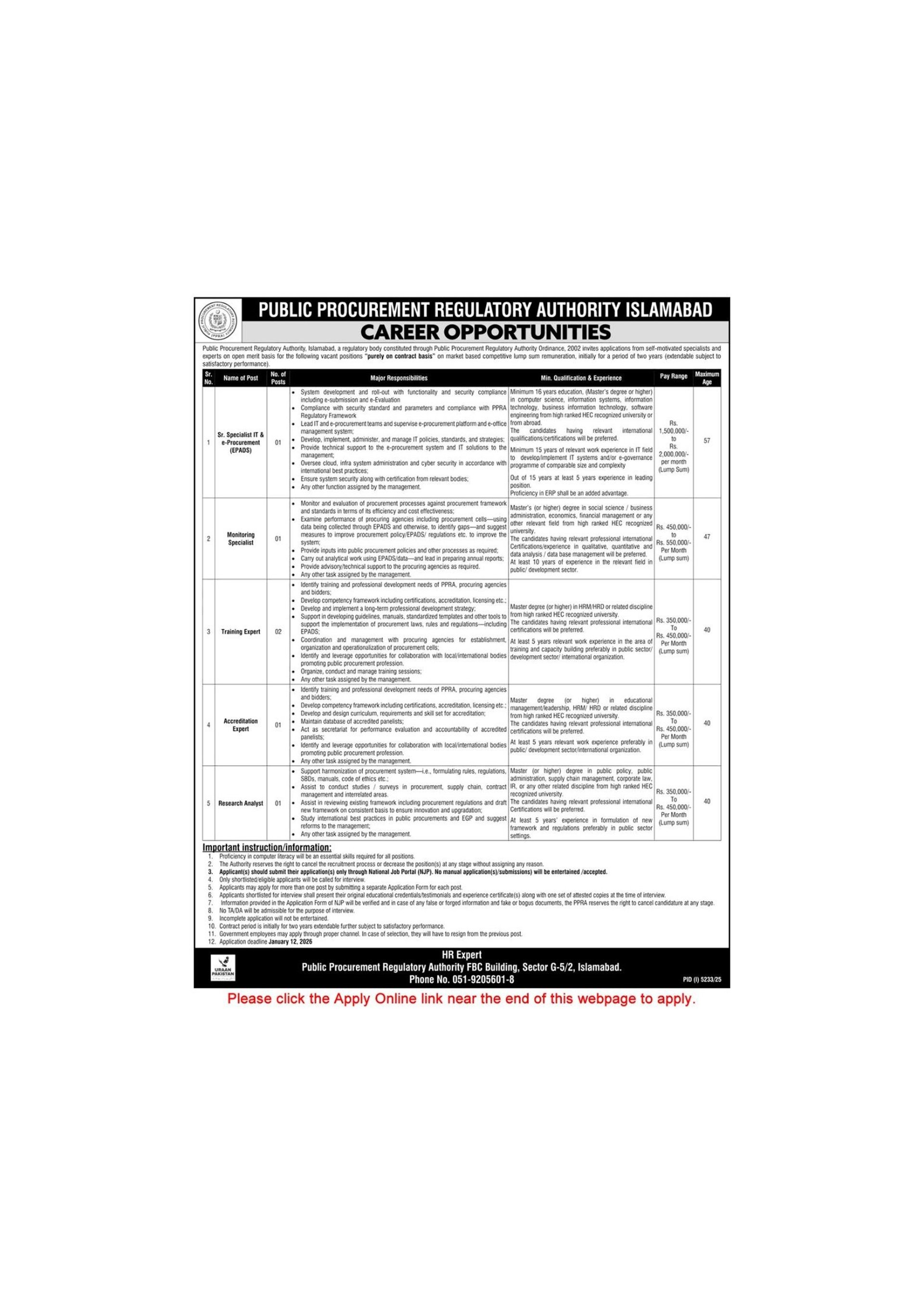Public Procurement Regulatory Authority Islamabad Jobs December 2025 / 2026 Apply Online PPRA Latest