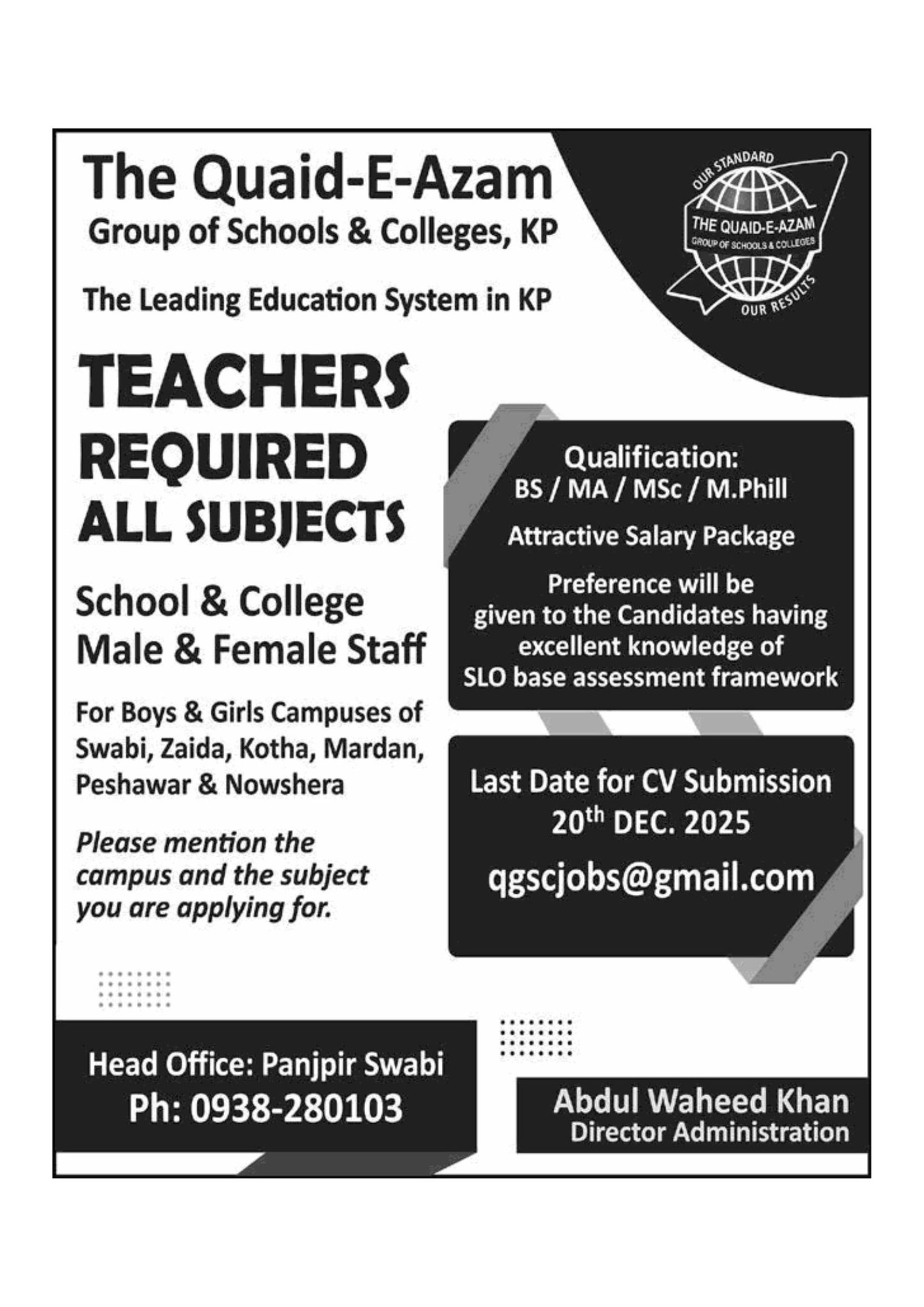 Teaching Jobs in Quaid-e-Azam Group of Schools & Colleges KPK December 2025