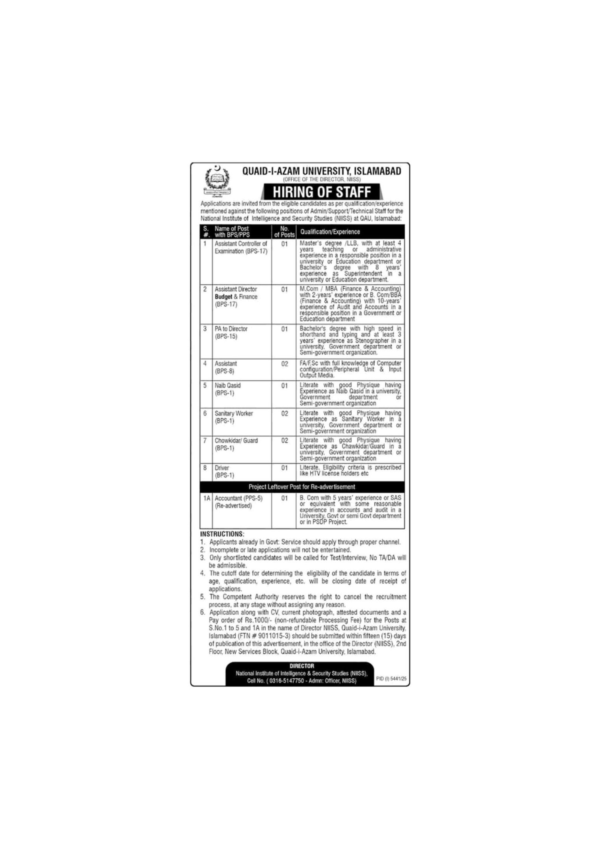Quaid e Azam University Islamabad Jobs Assistants, Chowkidar / Guards & Others QAU Latest