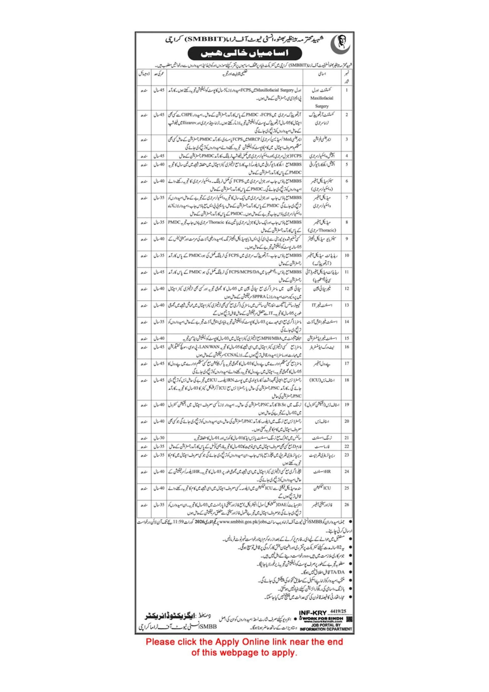 Shaheed Mohtarma Benazir Bhutto Institute of Trauma Karachi Jobs Apply Online SMBBIT Latest