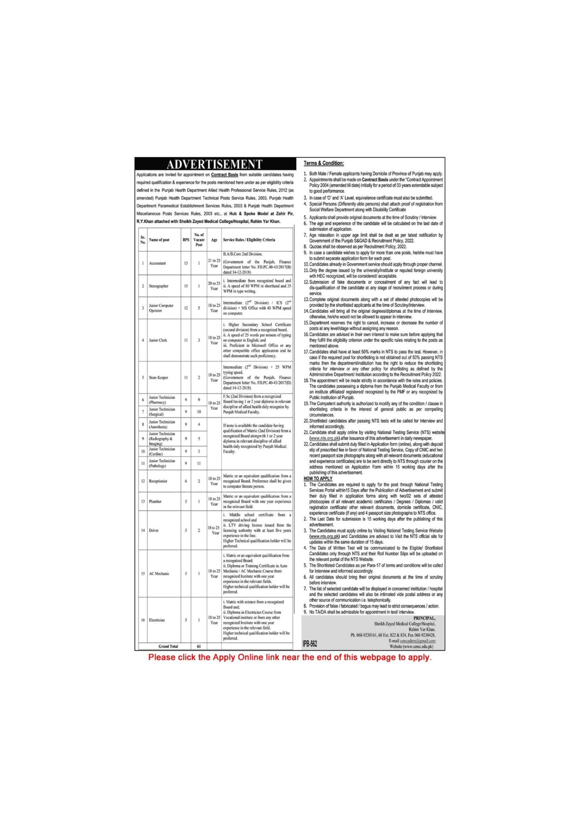 Sheikh Zayed Medical College / Hospital Rahim Yar Khan Jobs December 2025 / 2026 NTS Apply Online Latest