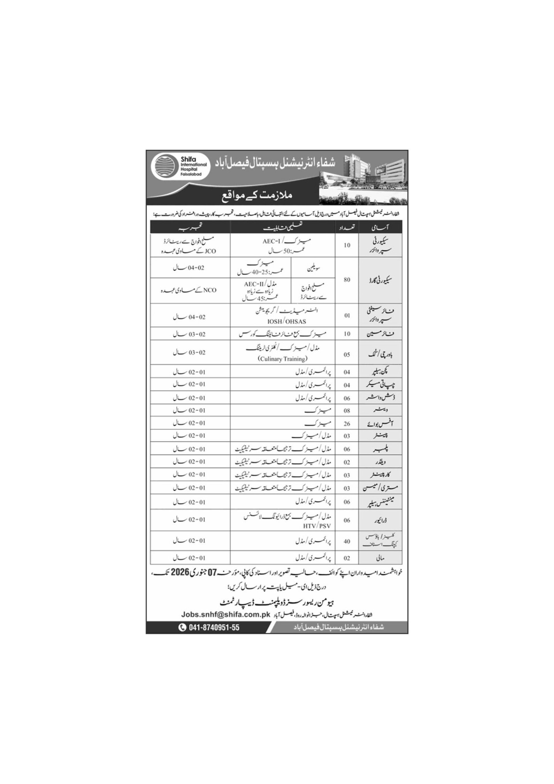 Shifa International Hospital Faisalabad Jobs December 2025 / 2026 Security Guards, Office Boys, Cleaners & Others SIHL