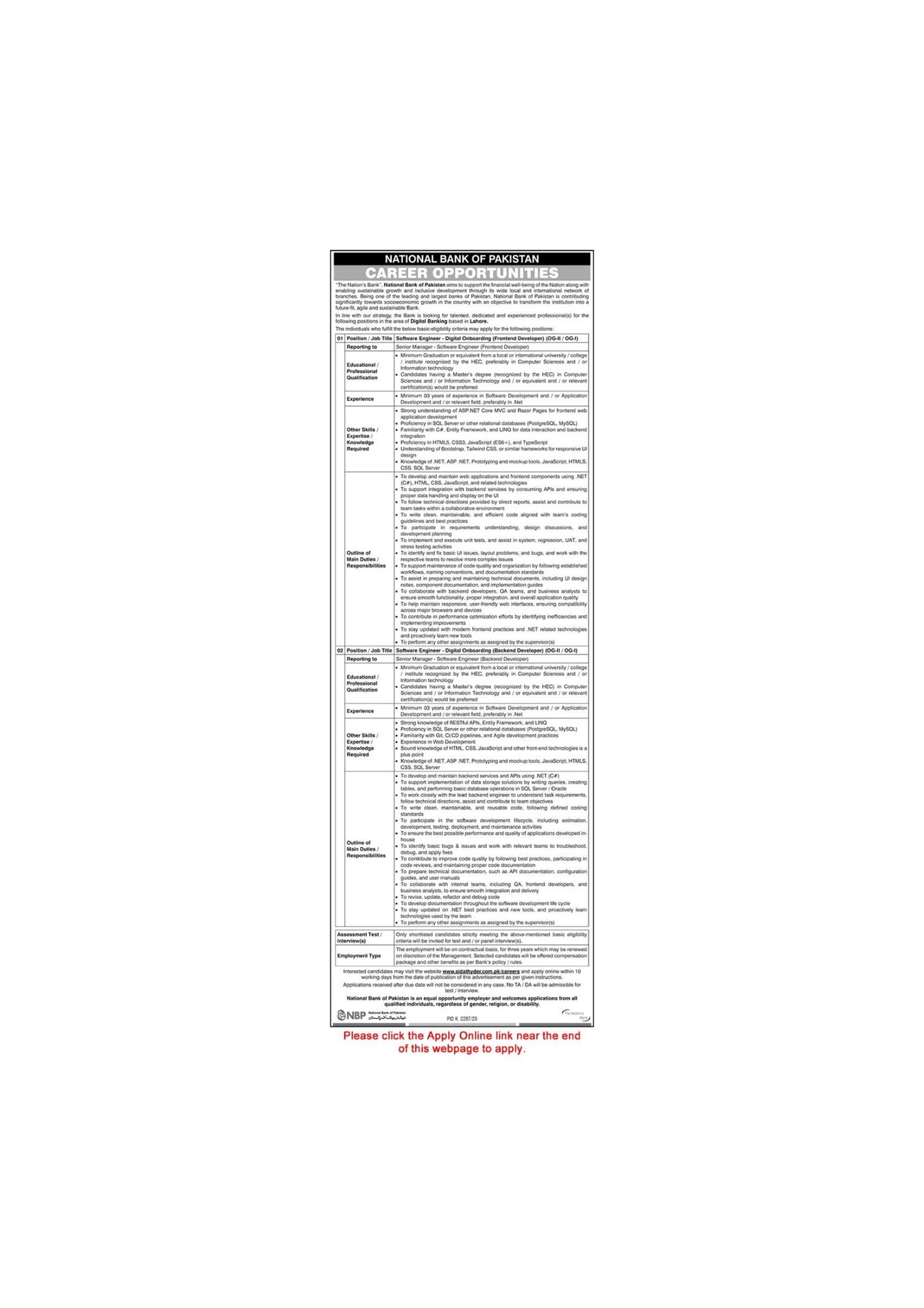 Software Engineer Jobs in National Bank of Pakistan 2026 Apply Online NBP Latest