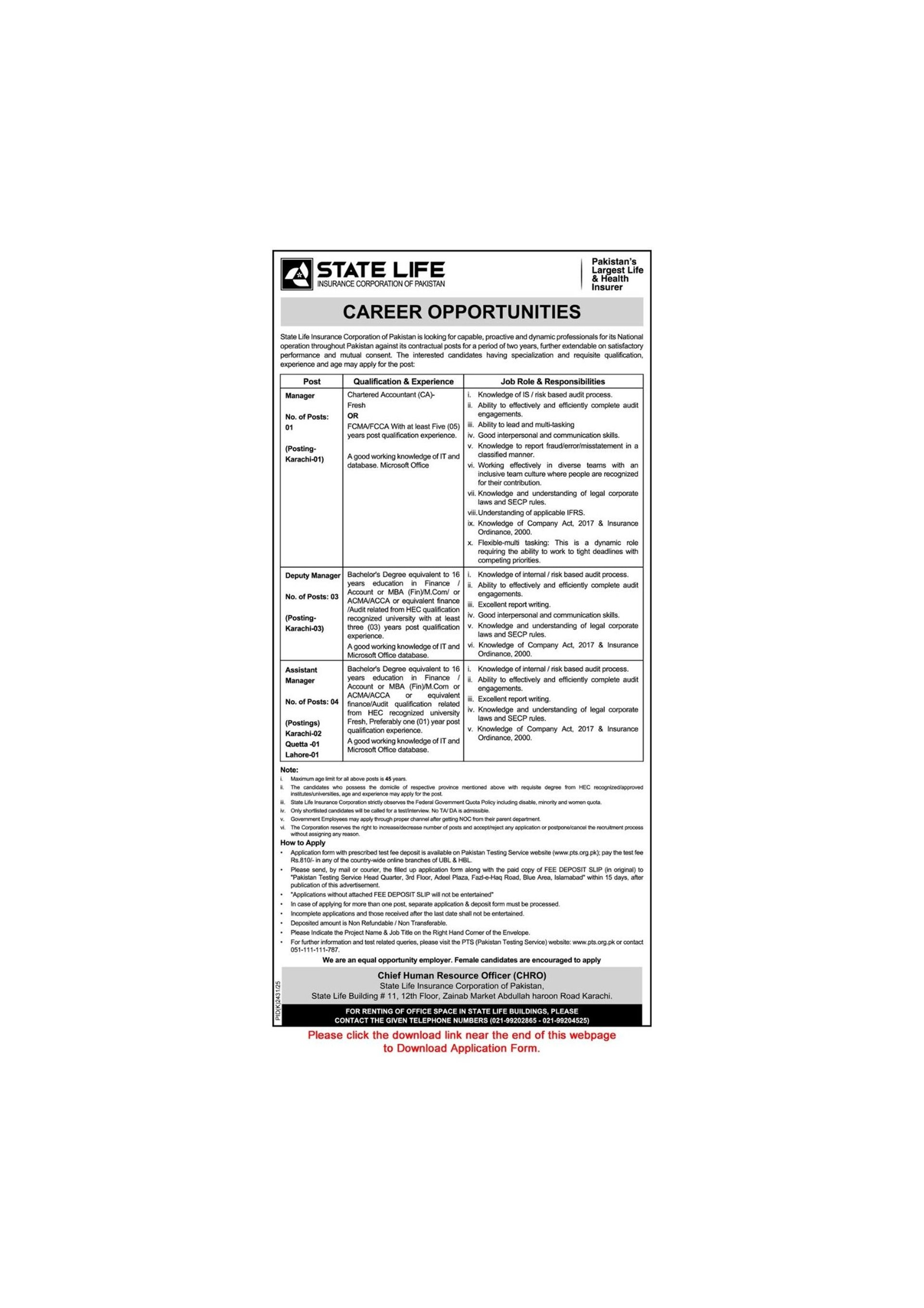 State Life Insurance Corporation of Pakistan Jobs PTS Application Form SLIC Assistant / Deputy Managers Latest