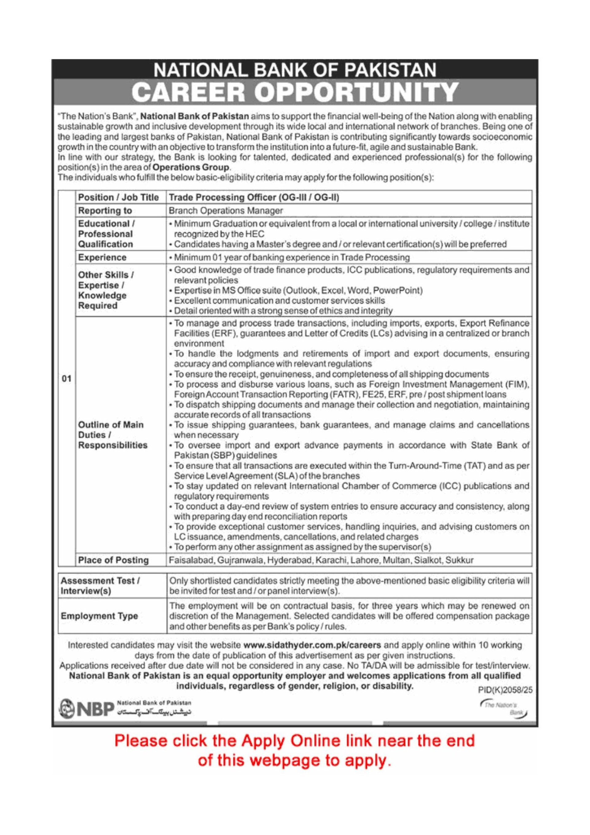 Trade Processing Officer Jobs in National Bank of Pakistan December 2025 Apply Online NBP OG-II / III