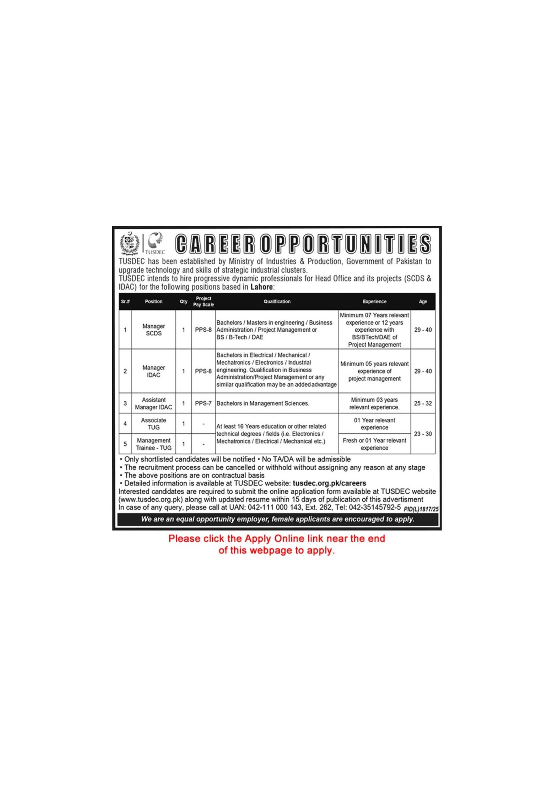 www.tusdec.org.pk/careers Online Apply