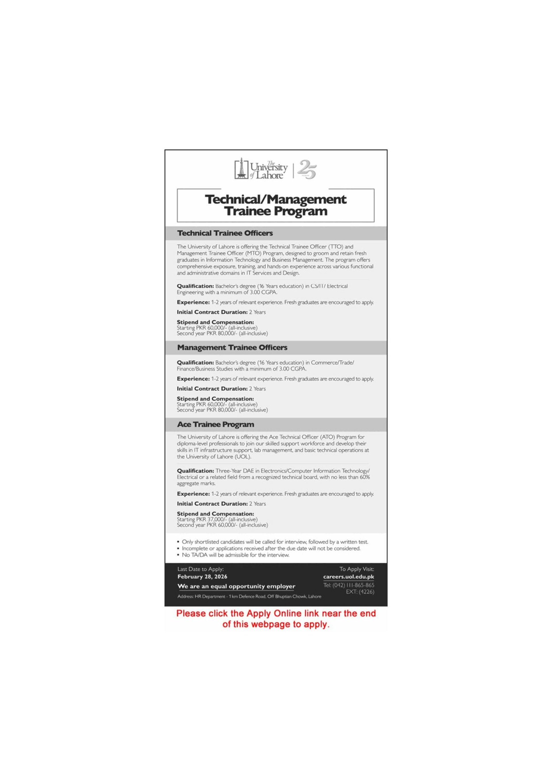 University of Lahore Technical / Management Trainee Program 2026 February Apply Online UOL